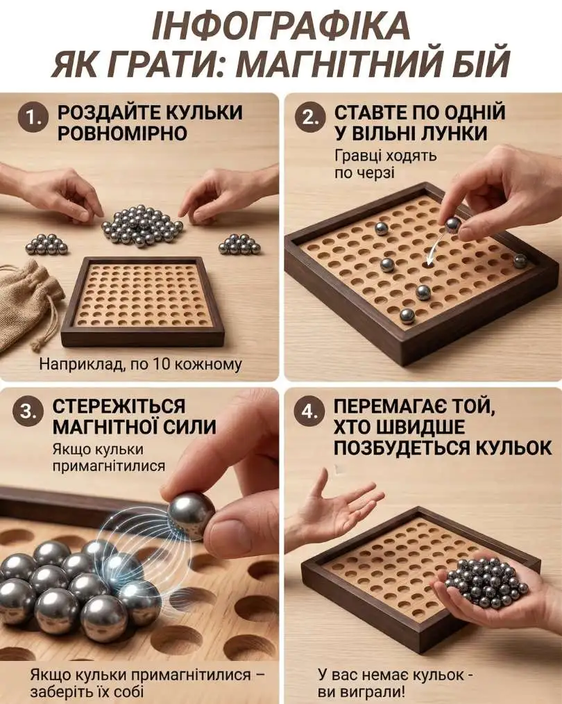 Продумуй кожен хід або змушуй суперників помилятись у «Магнітному бою» — швидкій грі для 2–4 гравців, де кожен рух може все змінити!