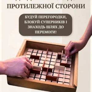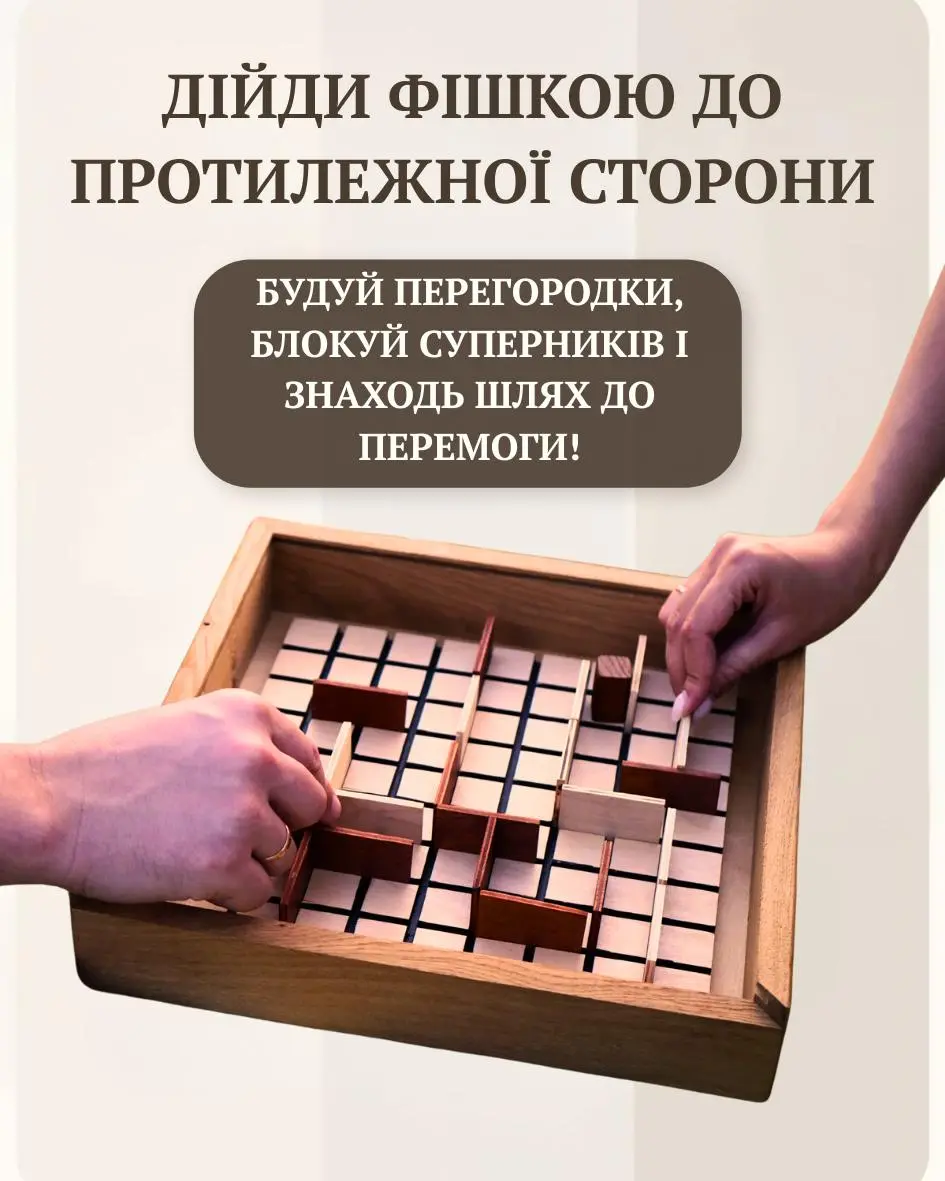 ♟ По черзі рухаєш фішку на одну клітинку.Або ставиш перегородку, щоб супернику було складніше пройти.